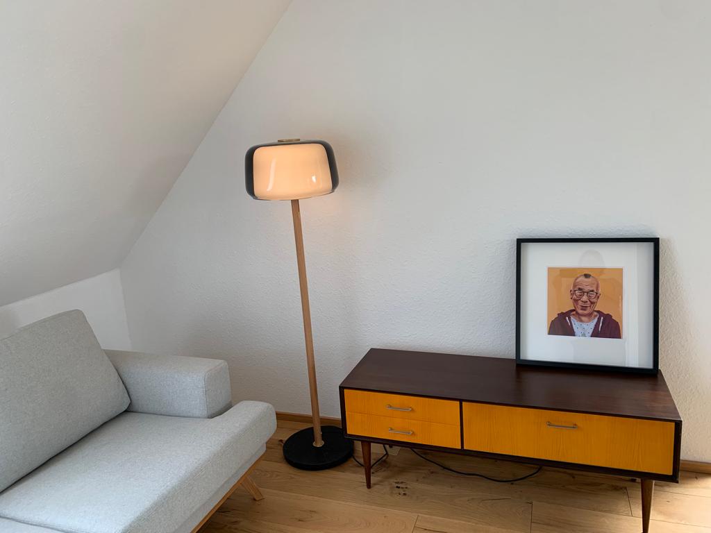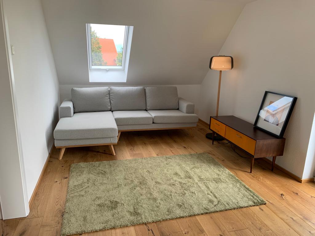 Die liebevoll eingerichtete, lichtdurchflutete Ferienwohnung befindet sich im Dachgeschoss des renovierten Bauernhauses und bietet vom großen Balkon einen Blick aufs freie Feld und steht doch mitten im Dorf.